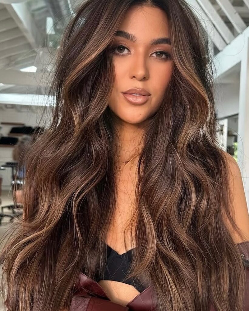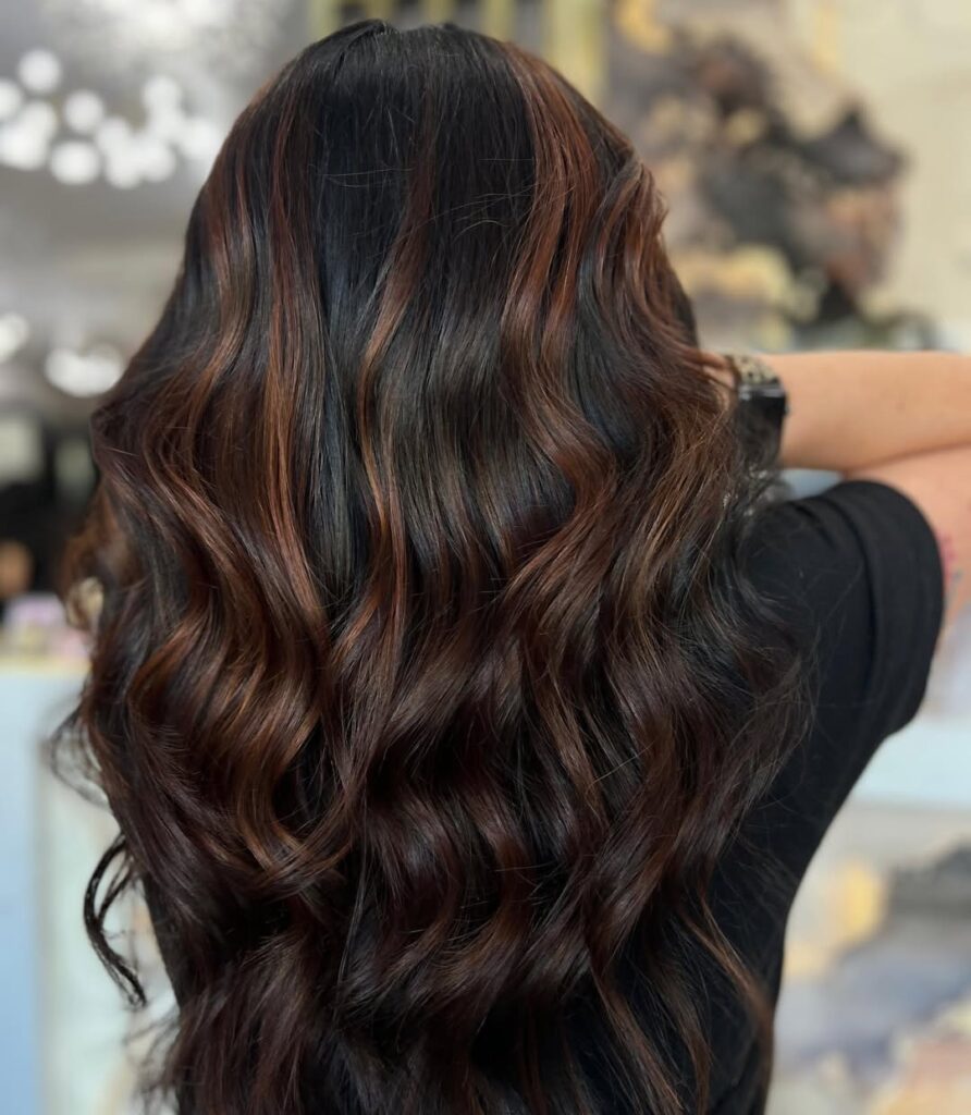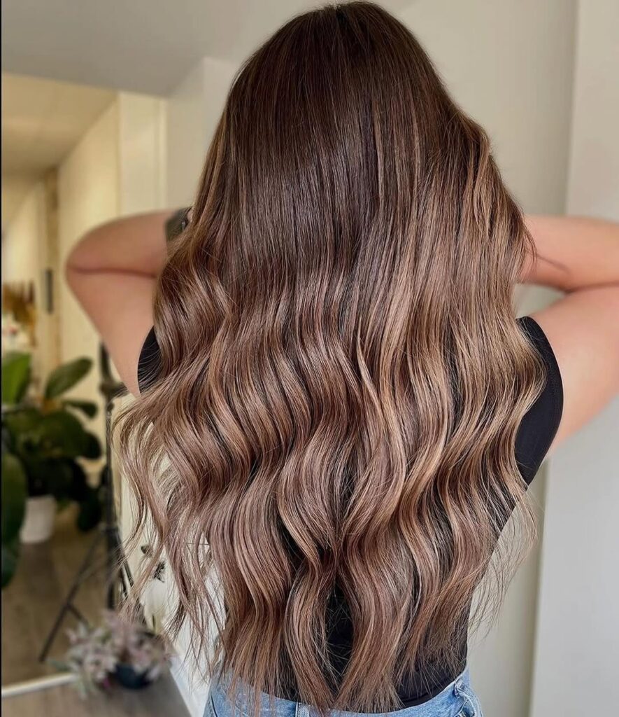 This shade blends dark mocha tones with caramel ribbons, giving hair a glossy, sun-kissed glow.