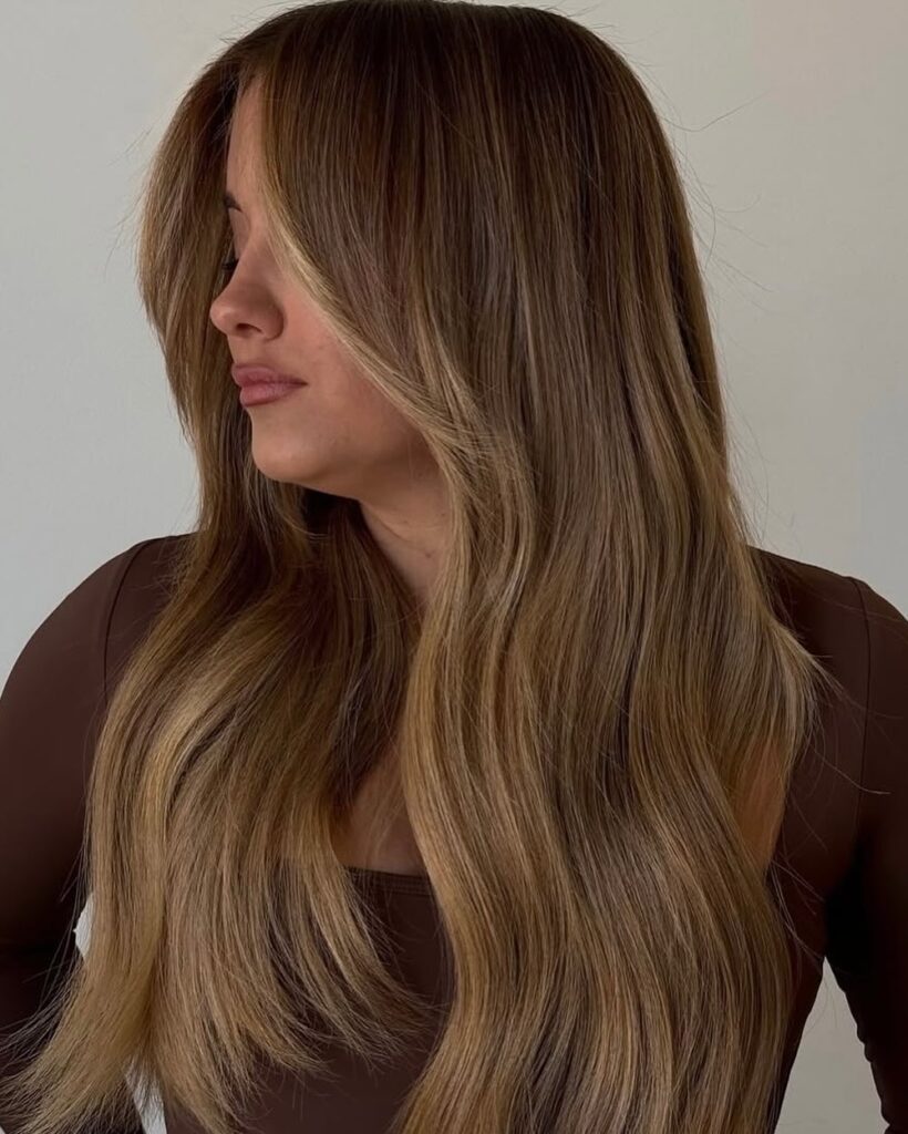 This shade mixes soft honey highlights with deep chestnut undertones, giving the hair a sun-kissed autumn glow.