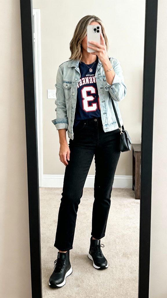 11. Denim Jacket + Team Tee + Black Jeans (Timeless & Easy)