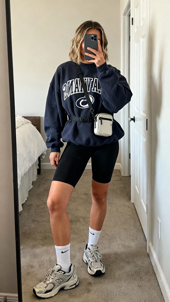 1. Oversized Team Sweatshirt + Bike Shorts (The No-Brainer Classic)