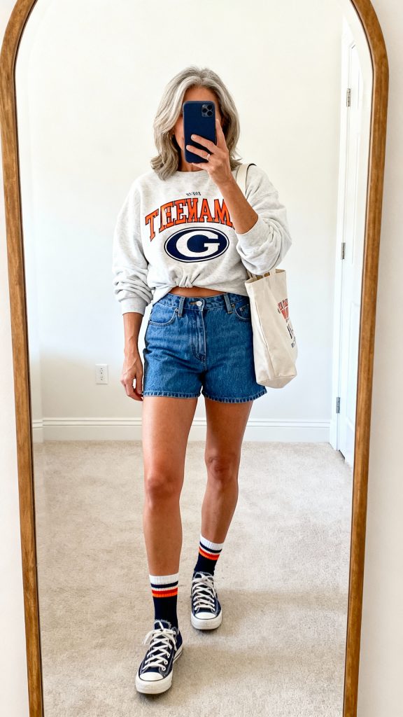 6. Graphic Sweatshirt + Denim Shorts (Early Season Go-To)