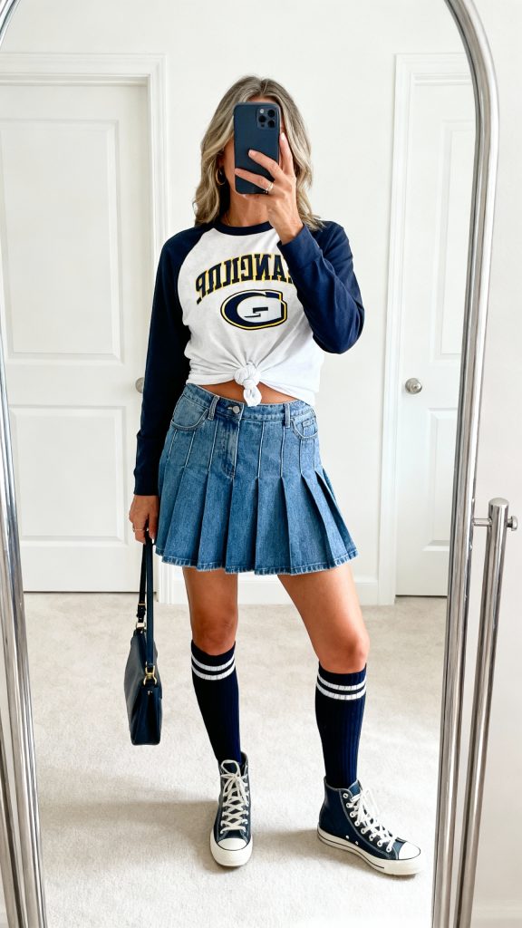 A mini skirt instantly makes your outfit feel styled, while the long-sleeve tee keeps it casual and game-appropriate.