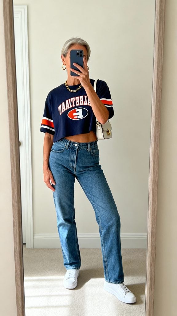 2. Cropped Team Tee + High-Waisted Jeans (Casual But Cute)