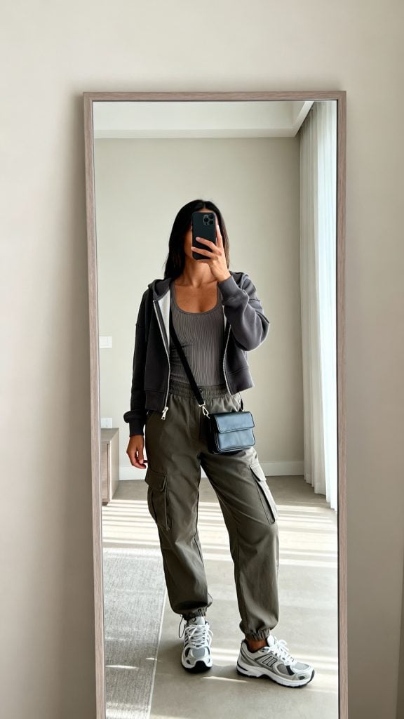 7. Fitted Tank + Zip-Up Hoodie + Cargo Pants (Athleisure Cool)