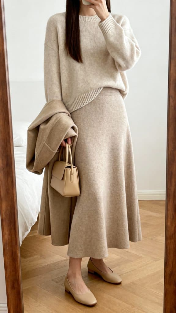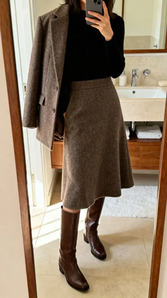 When you want polish without pants, this is it. A belted blazer over a ribbed knit long skirt serves structure and comfort at the same time. It’s sharp, warm, and surprisingly flexible for the office or events.