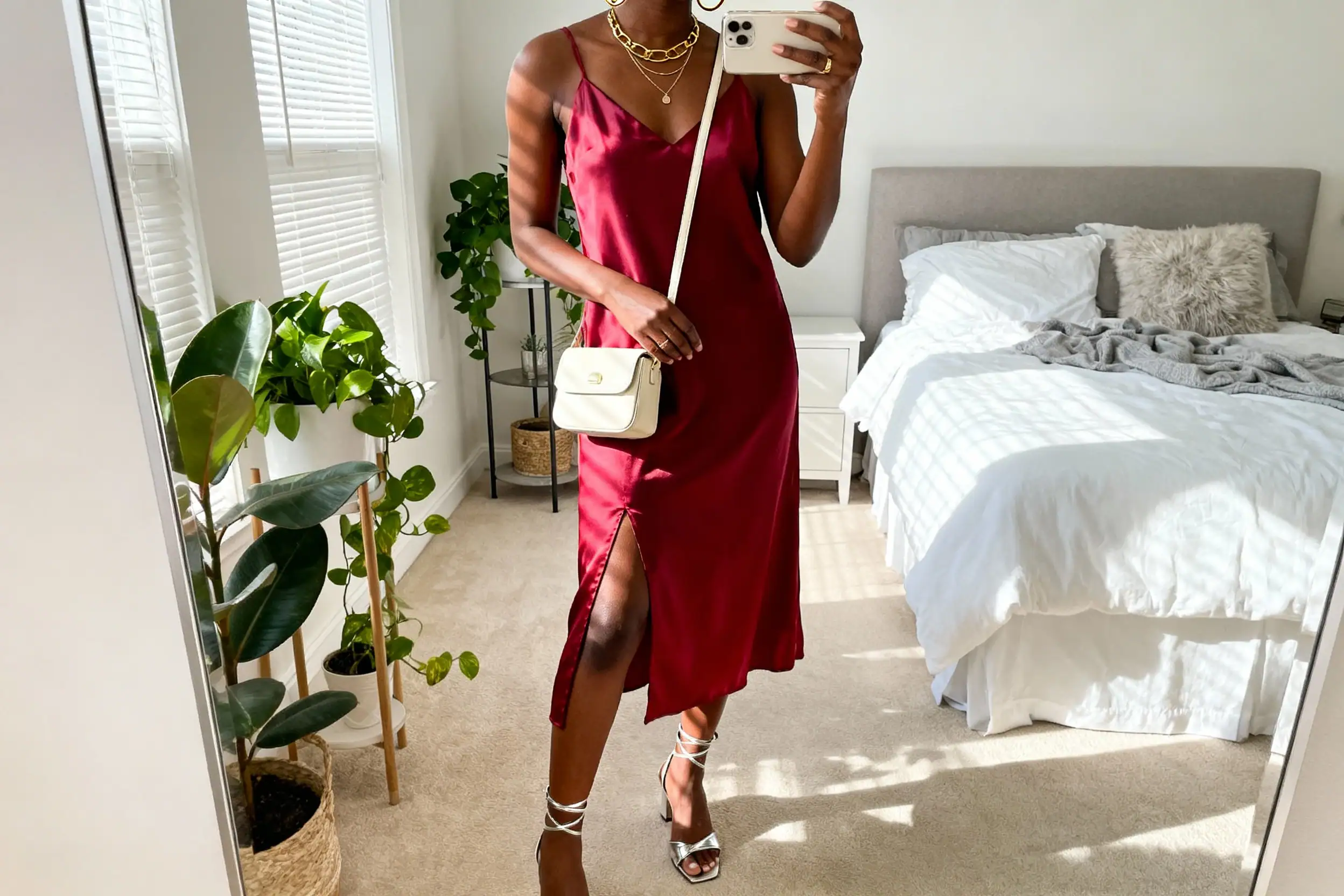 - Bias-cut red silk or satin slip dress (midi length)