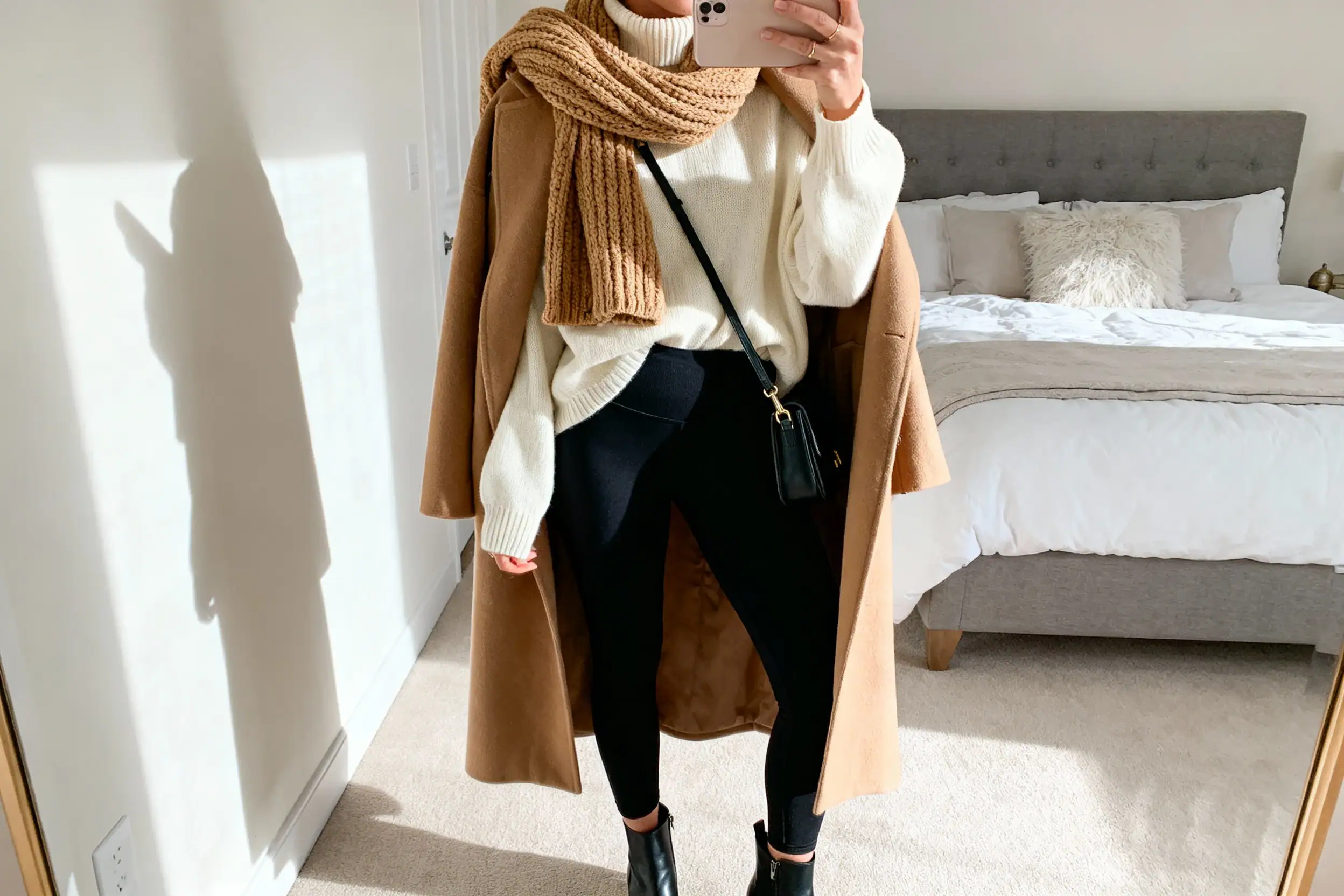 - Optional: wool coat in camel or black