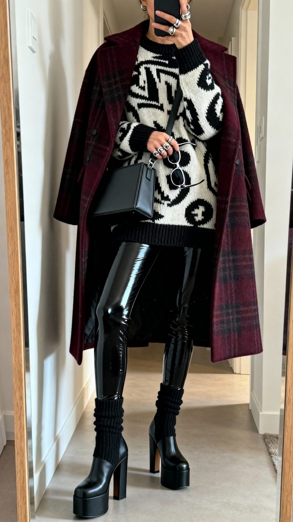 Sometimes winter needs a little extra attitude. A statement coat—think plaid, bold color, or faux fur—over a graphic knit and glossy leggings delivers just that. It’s fun, confident, and guaranteed to get compliments.