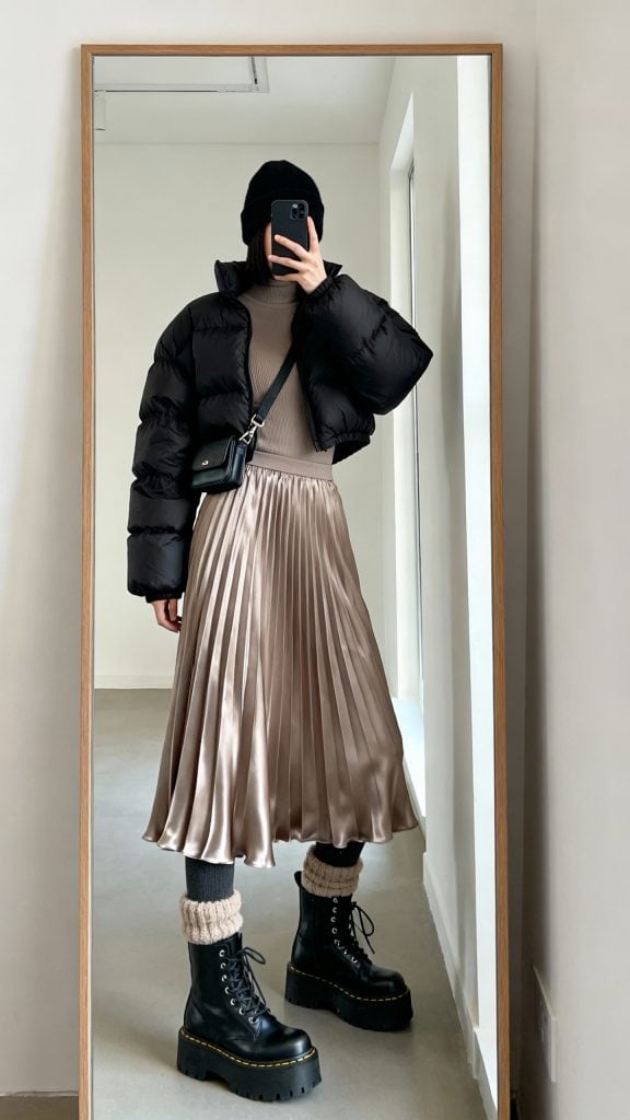 4. The Puffer + Pleated Skirt Street-Style Moment